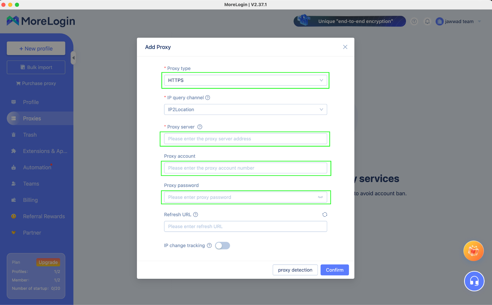The saved proxies can be recalled when configuring a browser profile inside MoreLogin.